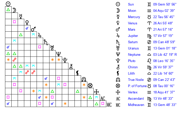 | Mars | 21 Aries 58 | 20 Leo 54 | 18 Gemini 10 |
