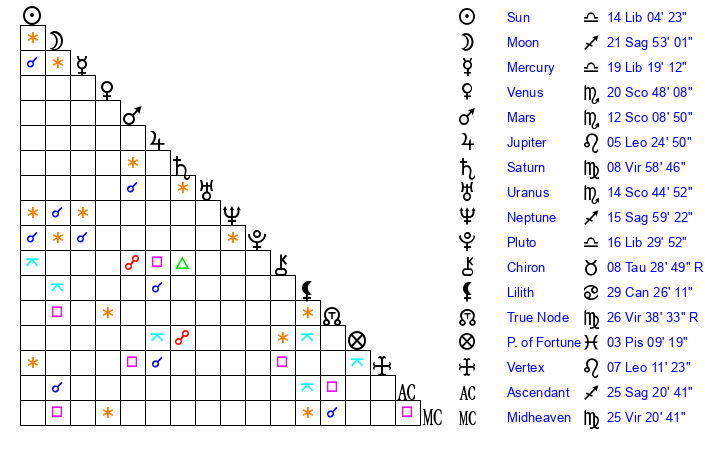 | Neptune | 15 Sagittarius 59 | 0 Aries 21 | 17 Sagittarius 25 |