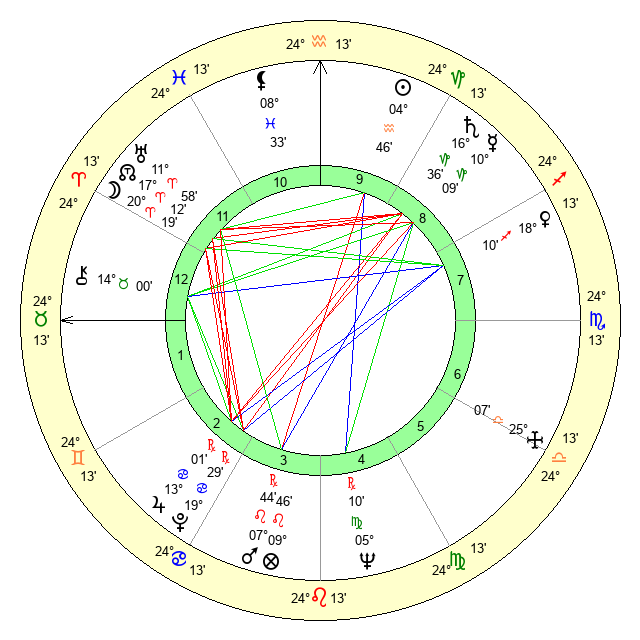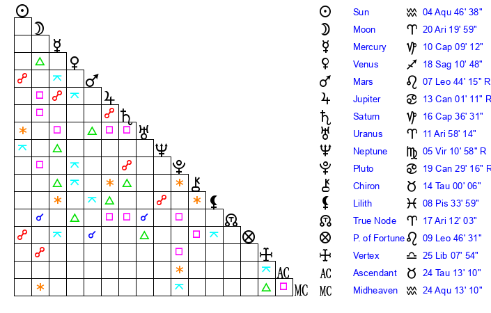 | Moon | 20 Aries 17 | 18 Sagittarius 48 | 4 Libra 5 |