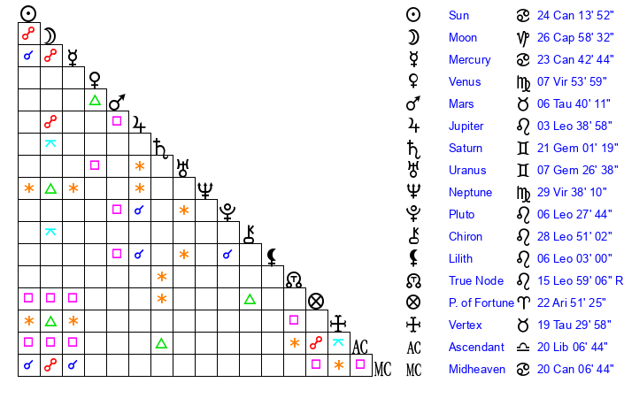 | Moon | 26 Capricorn 54 | 21 Aries 6 | 24 Capricorn 53 |