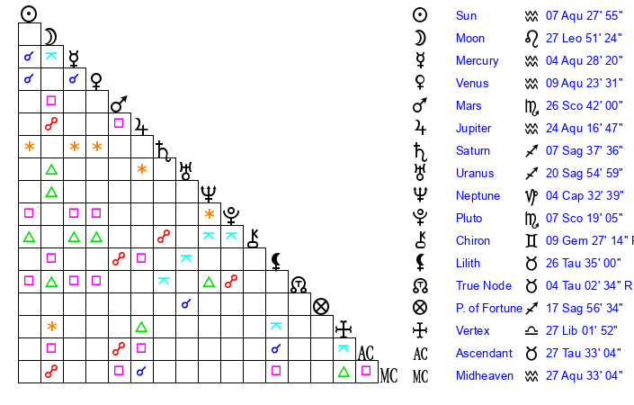 | Moon | 27 Leo 51 | 14 Capricorn 55 | 11 Aquarius 0 |