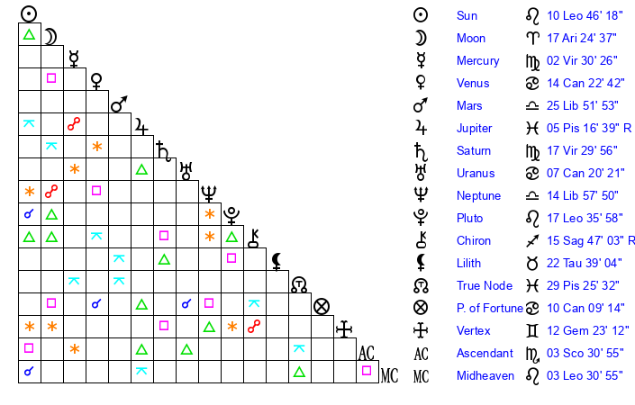 | Moon | 17 Aries 27 | 5 Sagittarius 27 | 17 Capricorn 39 |