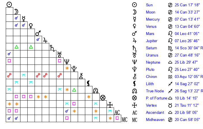 | Sun | 25 Cancer 17 | 26 Cancer 19 | 2 Libra 49 |