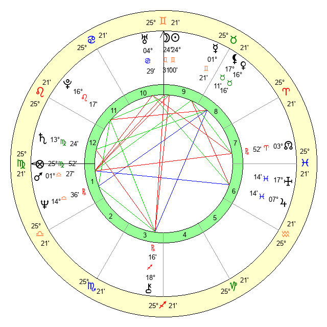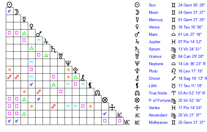 | Sun | 24 Gemini 0 | 24 Gemini 50 | 5 Virgo 46 |