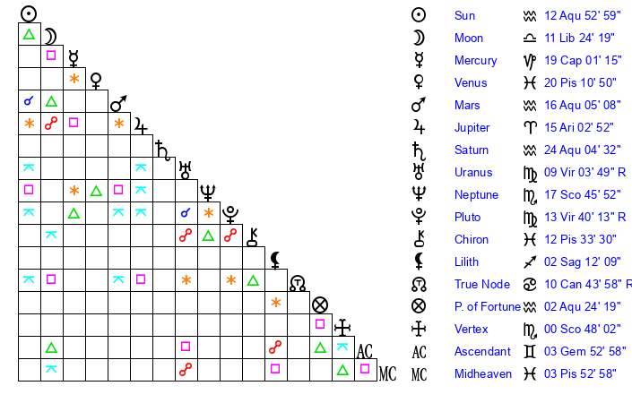 | Sun | 12 Aquarius 53 | 14 Aquarius 6 | 13 Aries 58 |