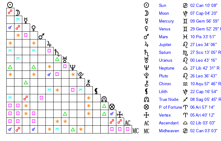| Moon | 6 Capricorn 59 | 8 Gemini 40 | 11 Cancer 26 |