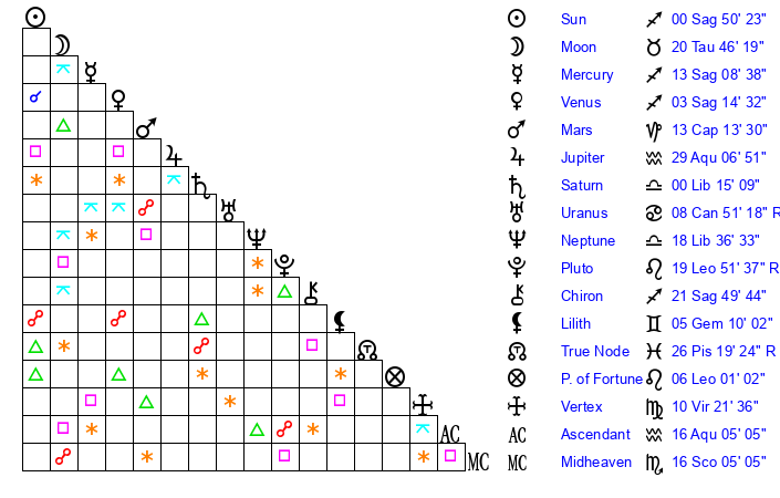 | Sun | 0 Sagittarius 50 | 1 Sagittarius 39 | 17 Aquarius 6 |