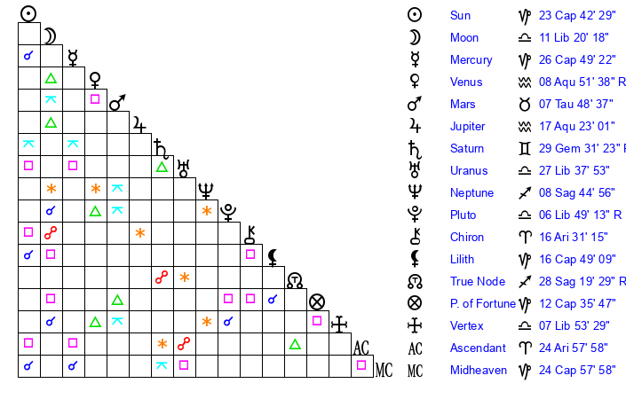 Jupiter | 17 Aquarius 14 | 12 Gemini 1 | 29 Aquarius 21 |