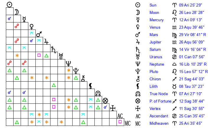 | Moon | 26 Leo 29 | 27 Aries 55 | 0 Gemini 26 |