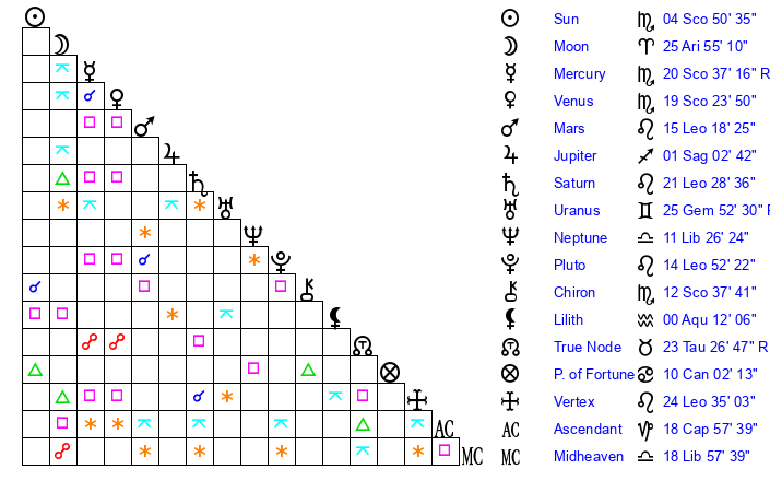 | Neptune | 11 Libra 26 | 29 Pisces 50 | 12 Libra 59 |