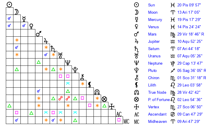 | Venus | 14 Pisces 24 | 9 Aries 16 | 19 Aries 14 |