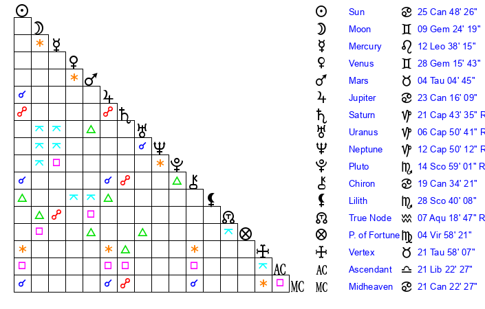 | Jupiter | 23 Cancer 15 | 8 Cancer 49 | 0 Leo 54 |