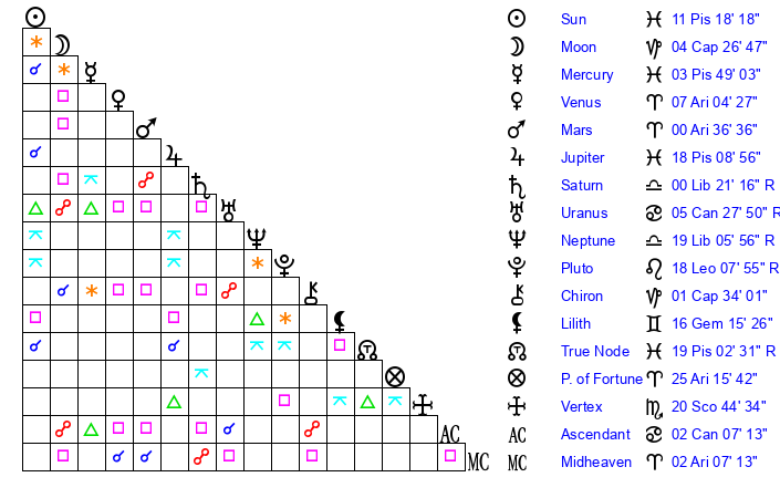 | Neptune | 19 Libra 5 | 28 Pisces 57 | 17 Libra 14 |