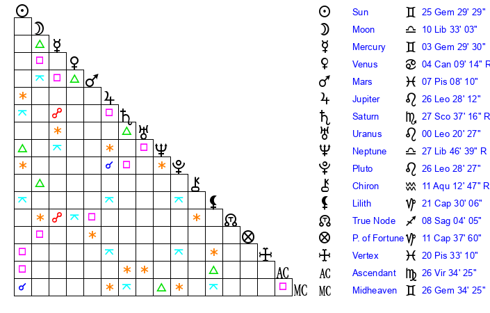 | Moon | 10 Libra 39 | 29 Aquarius 19 | 7 Aries 36 |