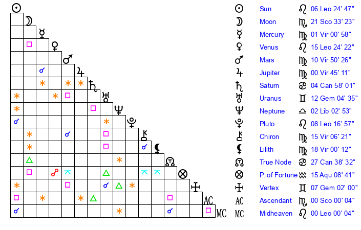 | Venus | 15 Leo 25 | 28 Gemini 19 | 25 Scorpio 6 |