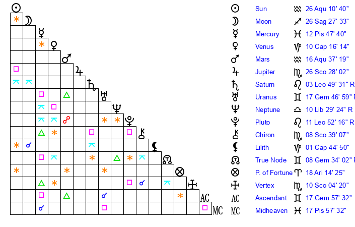 | Neptune | 10 Libra 29 | 28 Pisces 25 | 8 Libra 33 |