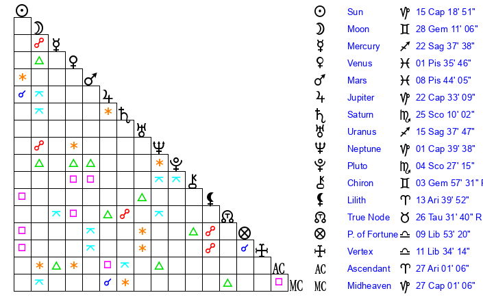 | Neptune | 1 Capricorn 40 | 27 Pisces 22 | 2 Capricorn 57 |