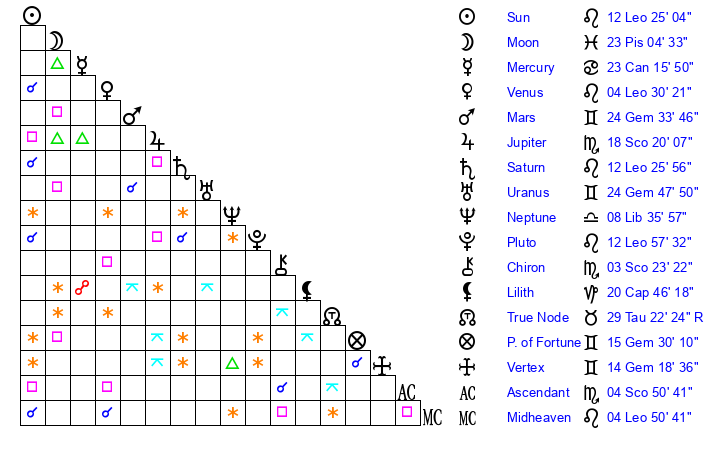 | Moon | 23 Pisces 7 | 29 Sagittarius 56 | 5 Aquarius 40 |