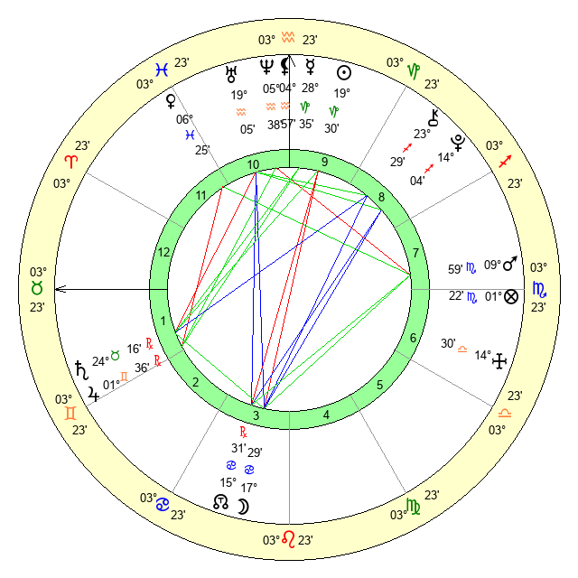 | Mars | 10 Scorpio 0 | 28 Cancer 46 | 23 Scorpio 30 |