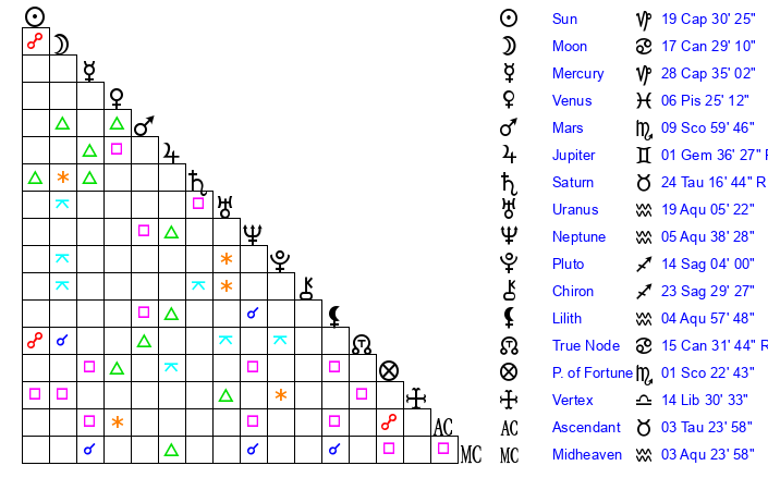 | Neptune | 5 Aquarius 38 | 27 Pisces 26 | 6 Aquarius 32 |
