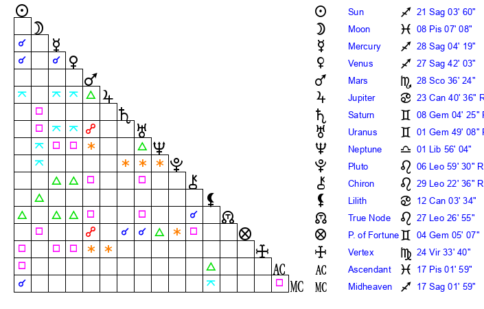 | Venus | 27 Sagittarius 43 | 16 Sagittarius 11 | 11 Aries 22 |