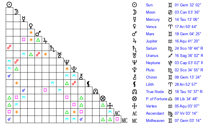 | Jupiter | 16 Aquarius 39 | 25 Gemini 57 | 15 Aquarius 49 |