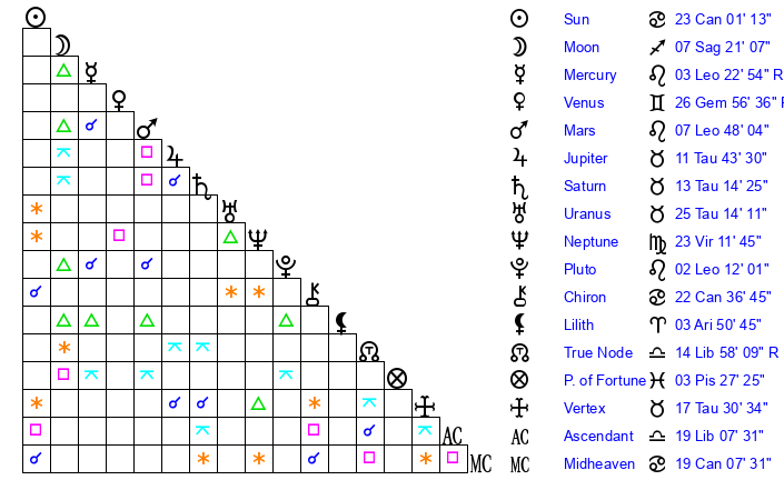 | Moon | 7 Sagittarius 18 | 23 Pisces 19 | 20 Capricorn 42 |
