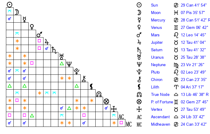 | Mercury | 28 Cancer 51 | 14 Leo 45 | 16 Scorpio 3 |