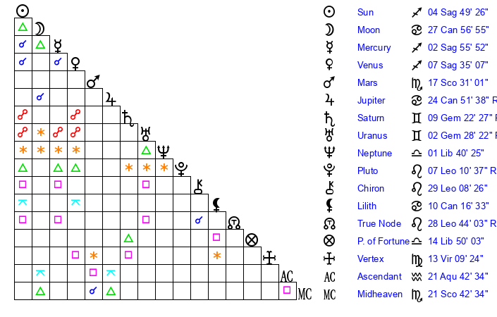| Sun | 4 Sagittarius 50 | 5 Sagittarius 42 | 29 Aquarius 11 |