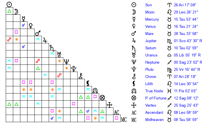 | Venus | 16 Taurus 22 | 24 Pisces 54 | 22 Cancer 51 |