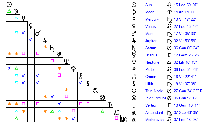 | Pluto | 8 Leo 34 | 2 Aquarius 14 | 10 Leo 13 |