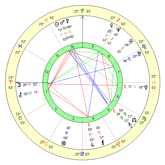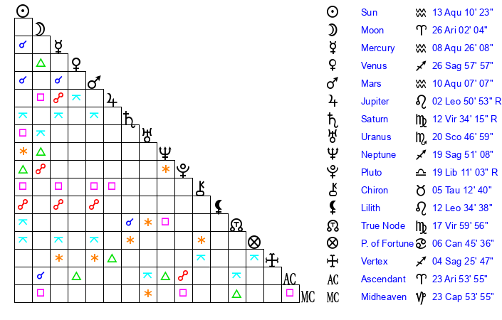 | Moon | 25 Aries 59 | 8 Aries 10 | 18 Sagittarius 35 |