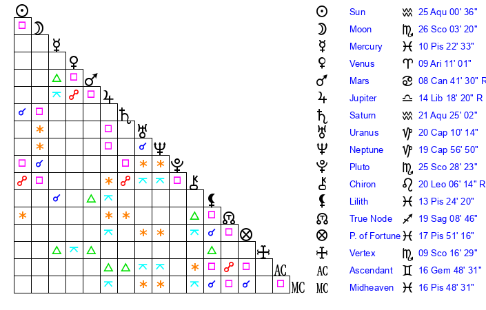 | Pluto | 25 Scorpio 27 | 2 Aquarius 26 | 25 Scorpio 24 |