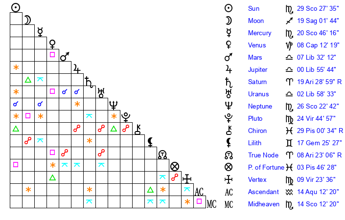 | Neptune | 26 Scorpio 23 | 29 Pisces 27 | 28 Scorpio 13 |