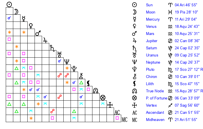 | Moon | 19 Pisces 29 | 14 Aquarius 24 | 12 Cancer 7 |