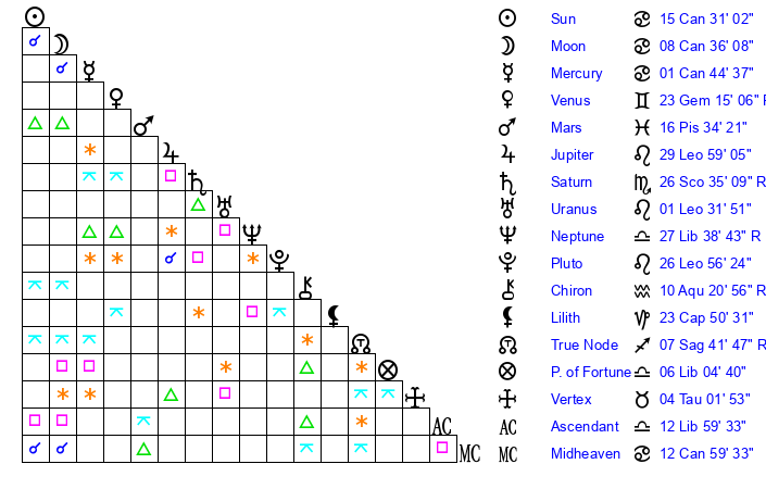 | Moon | 8 Cancer 37 | 9 Sagittarius 30 | 21 Capricorn 27 |