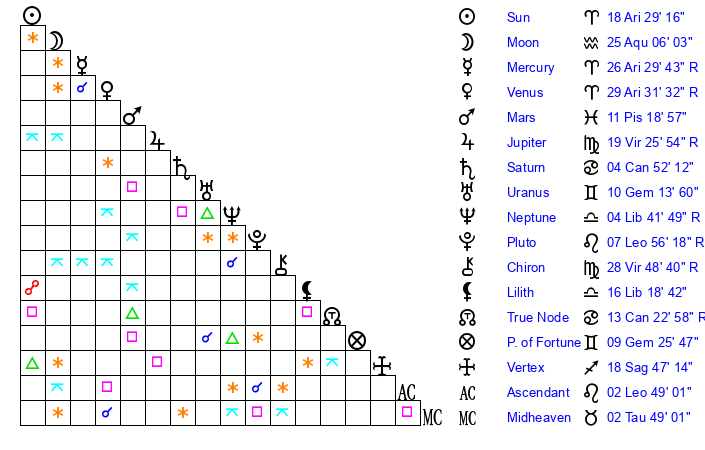 | Venus | 29 Aries 32 | 25 Pisces 1 | 20 Taurus 0 |