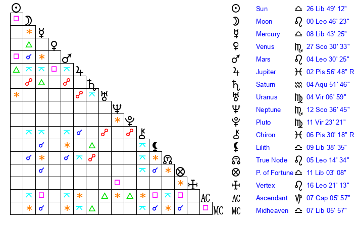 | Sun | 26 Libra 49 | 27 Libra 33 | 0 Capricorn 23 |