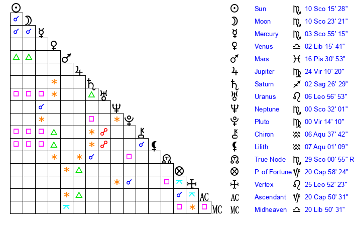 | Neptune | 0 Scorpio 32 | 29 Pisces 44 | 2 Scorpio 27 |