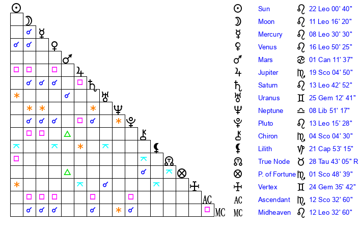 | Pluto | 13 Leo 15 | 2 Aquarius 5 | 14 Leo 53 |
