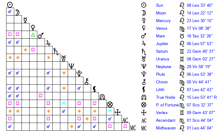 | Moon | 14 Leo 24 | 11 Scorpio 41 | 16 Leo 10 |