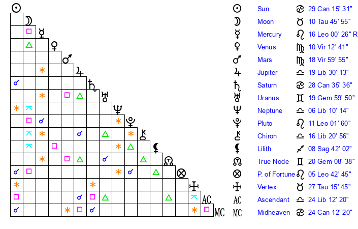 | Venus | 10 Virgo 13 | 20 Gemini 17 | 26 Scorpio 41 |