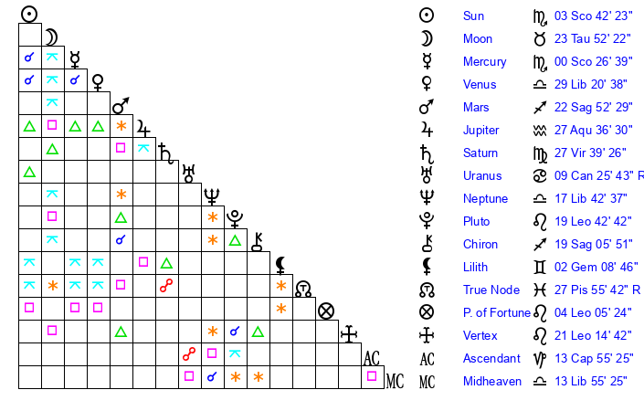 | Neptune | 17 Libra 42 | 29 Pisces 52 | 19 Libra 30 |