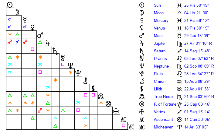 | Moon | 4 Libra 23 | 22 Libra 44 | 24 Pisces 2 |