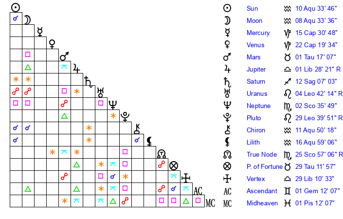 | Moon | 8 Aquarius 30 | 26 Aquarius 25 | 29 Cancer 53 |