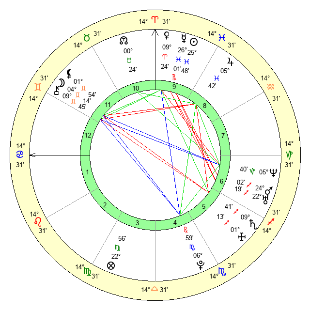 | Moon | 4 Gemini 7 | 22 Libra 44 | 6 Scorpio 40 |
