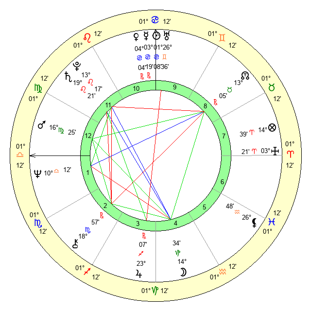 | Sun | 1 Cancer 9 | 1 Cancer 31 | 14 Virgo 57 |