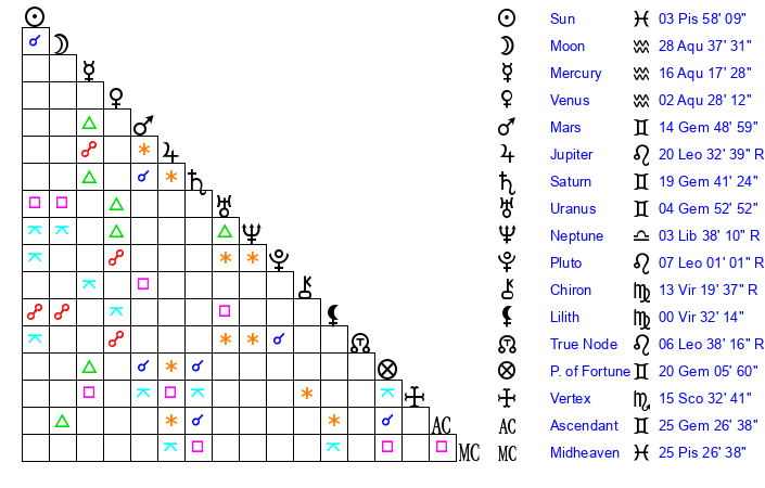 | Sun | 3 Pisces 58 | 5 Pisces 20 | 23 Taurus 45 |