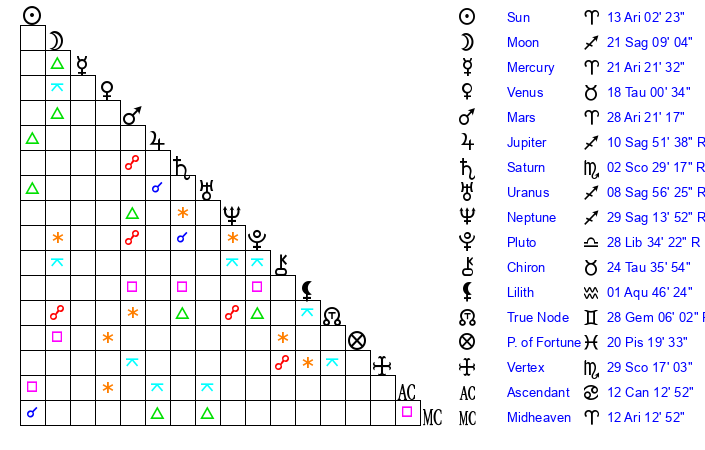 | Moon | 21 Sagittarius 6 | 21 Gemini 58 | 27 Gemini 47 |