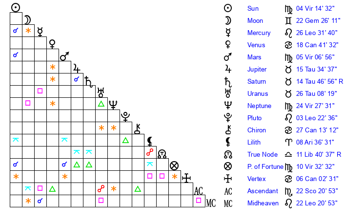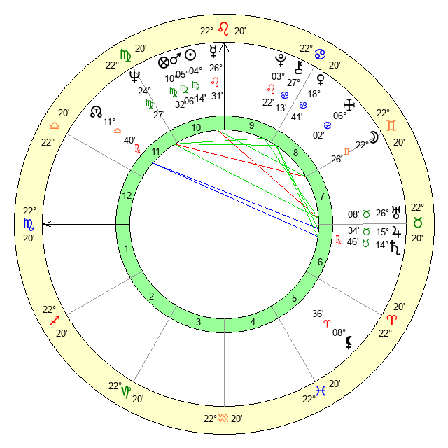 | Moon | 22 Gemini 16 | 25 Libra 50 | 3 Leo 26 |